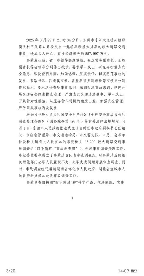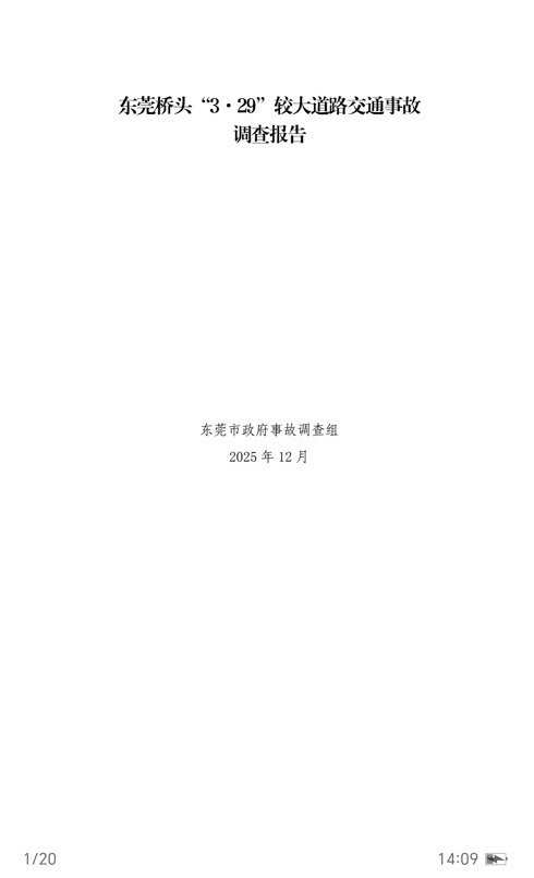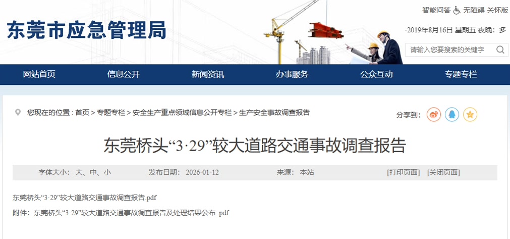 东莞市应急管理局2026年1月12日发布《东莞桥头“3·29”较大道路交通事故调查报告》,东莞市纪委监委也在官网公布了这起事故的处理结果。