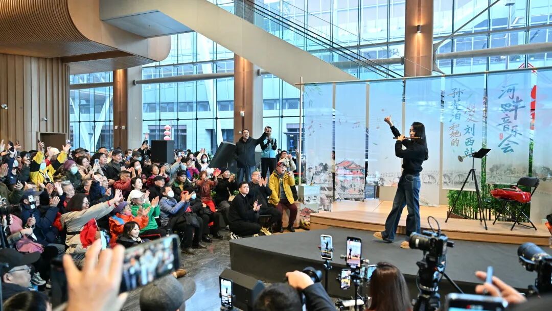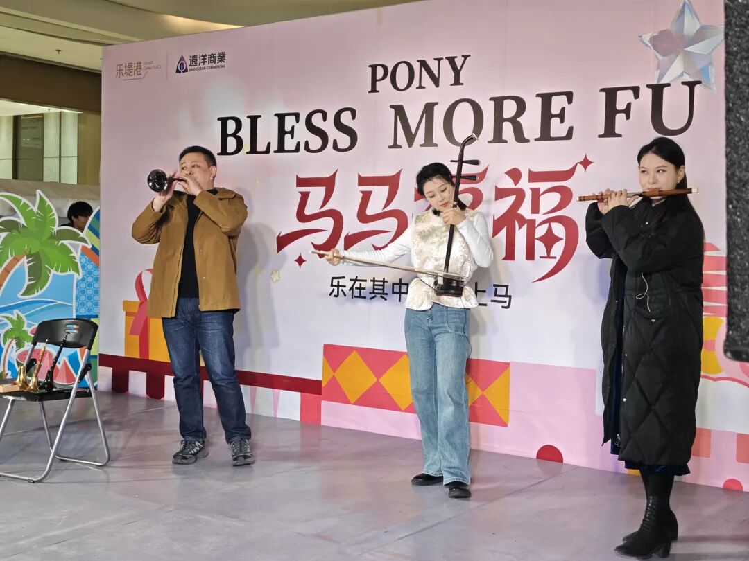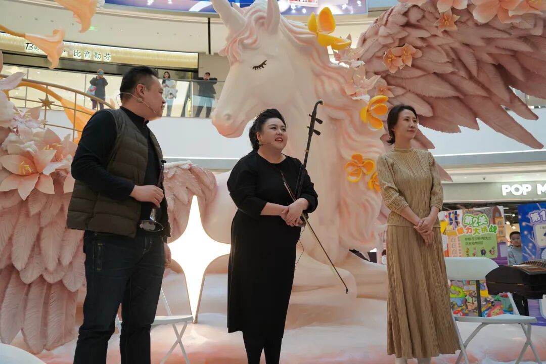 “唢呐一响,黄金万两,新的一年,我给大家添添喜气。”北京民族乐团唢呐演奏员王向阳熟练地向大家问了声好。1月11日下午,通州区远洋乐堤港行人不断,一段《黄土情》在东区1层中庭里嘹亮吹响,很快,小舞台前便里里外外围了几层人,还有不少观众慢下脚步,从楼上好奇地向下张望:王向阳带三支唢呐上台,《百鸟朝凤》吹得酣畅淋漓,二胡演奏员孙晓煜弓弦急动,《赛马》气势奔腾,竹笛演奏员蒋锦雯用排箫吹起《月亮代表我的心》,温柔舒展。约一个小时的演出,喝彩连连,掌声不断,周末时光被音乐温暖点亮。