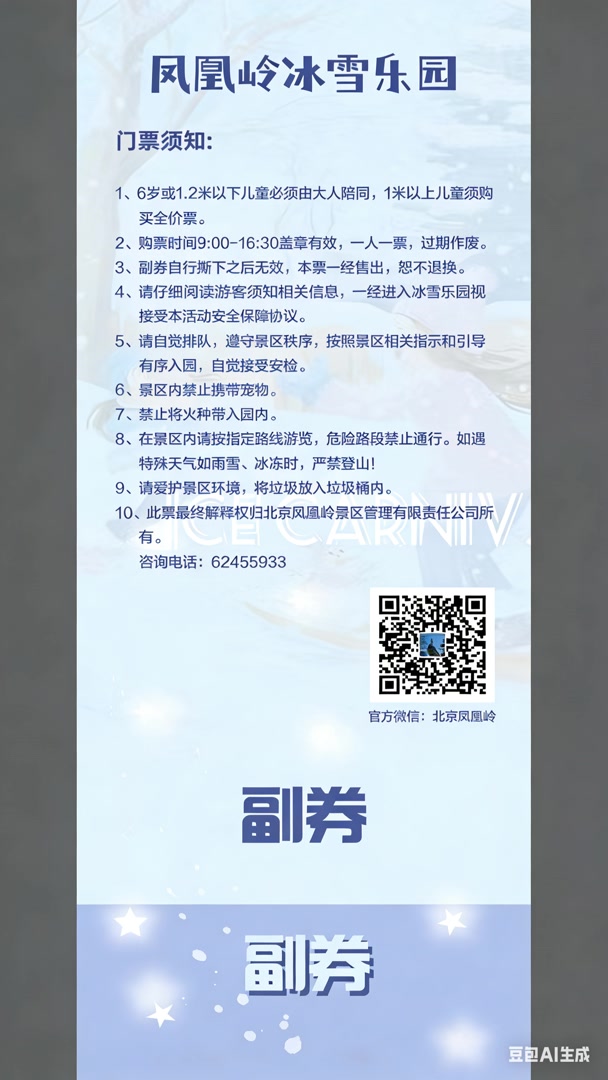 留言写下您和海淀的文旅故事,我们将结合点赞量选择5位网友,每人赠送两张价值188元的凤凰岭冰雪乐园门票(含景区门票)!包括欢乐滑雪圈和所有项目入园当天无限次畅玩!