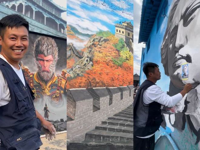 这已是他第二次带火老家吴营村。上次是2025年初,他在村里画的哪吒主题墙绘引起关注。这次爆火,则是因为一面“天安门”巨幅墙绘。
