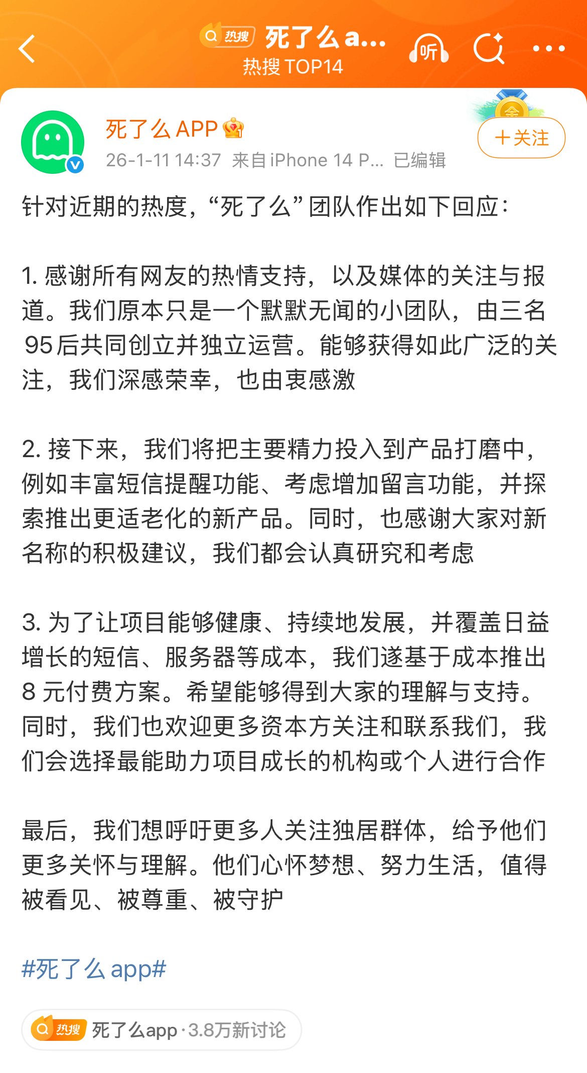 “死了么”App官方在1月11日回应近期热议,表示原本只是一个默默无闻的小团队,由三名95后共同创立并独立运营,能够获得如此广泛的关注,由衷感激。接下来,团队将把主要精力投入到产品打磨中,探索推出更适老化的新产品。对于网友对应用名字提出的建议,官方也表示感谢大家对新名称的积极建议,会认真研究和考虑。