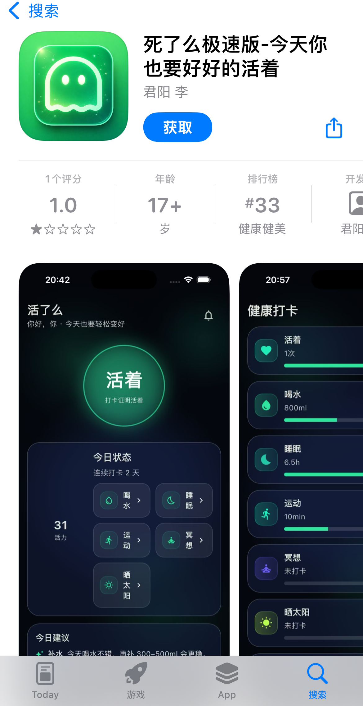 由于技术门槛相对较低,记者注意到,该软件的竞争对手已经出现。苹果商城上架了一款名为“死了么极速版”的软件,并添加“睡眠”“喝水”“运动”等状态,当前支持免费下载。