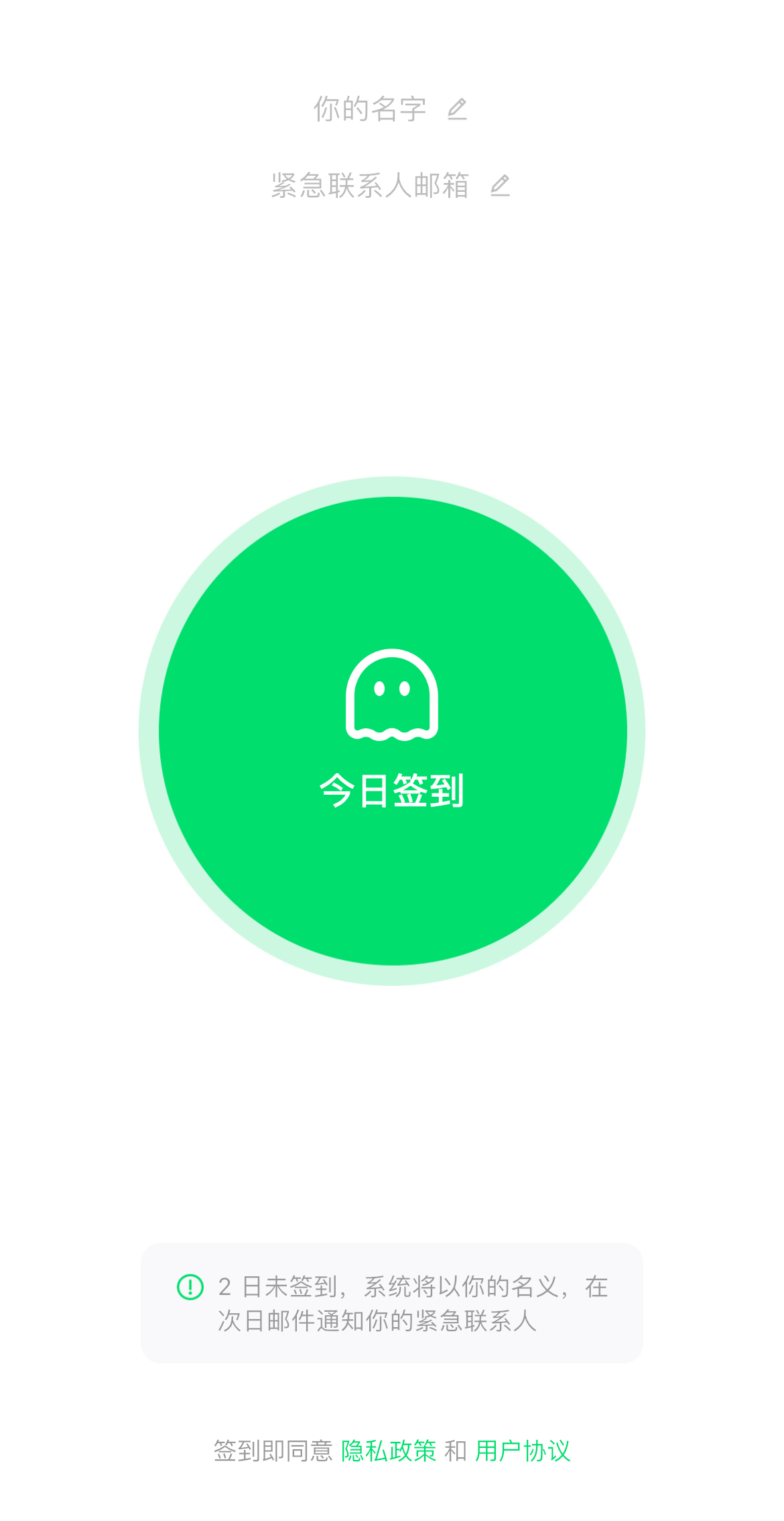 记者付费下载该应用体验,发现其应用界面简洁清晰,用户输入名字和紧急联系人邮箱,并点击中间圆形绿色按钮即可完成每日签到打卡,下方小字标明“两日未签到,系统将以你的名义,在次日邮箱通知你的紧急联系人”。