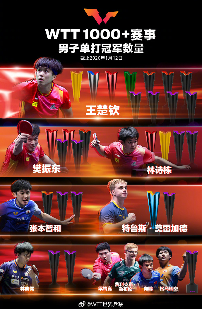 WTT1000+冠军榜更新,王楚钦、孙颖莎分列第一
