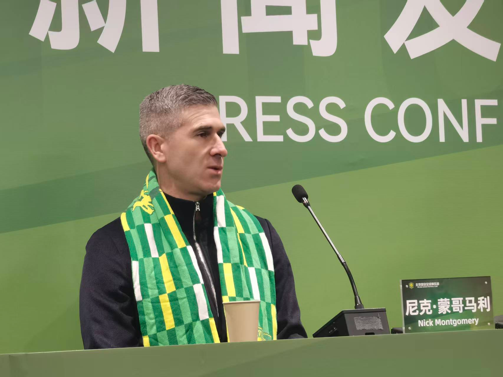 被问到对北京的印象,蒙哥马利的回答是球迷非常热情,他现在仍记得2014年亚冠小组赛做客工体时国安球迷给予他和客队的巨大压迫感。当然,飞抵北京后他也受到了国安球迷的热情欢迎。直到发布会上,他还戴着球迷在机场送给他的俱乐部绿色围巾。