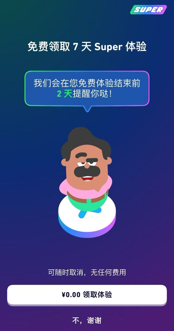 记者登录多邻国发现,这款软件以“提前提醒”以及“可随时取消,无任何费用”为噱头宣传7天免费体验,但在确认订阅套餐页面却用不起眼的小字提醒“如不想续订,请在试用结束前至少24小时取消订阅”,这一限制和该软件宣传的“随时取消”相矛盾。