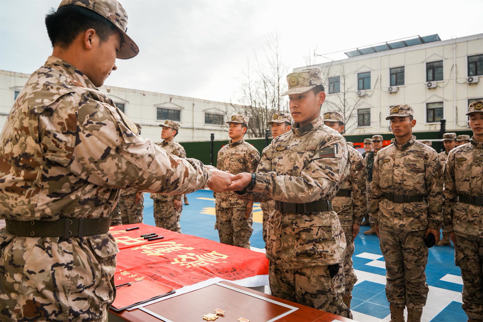 “吕俊杰,你是中队第129名战士,请入列!”伴随着庄重的口令,新兵们接过专属荣誉编号,这串数字不仅是军营身份的象征,更承载着使命与担当。授予仪式上,军旗飘扬、誓言铿锵,新兵们双手接过编号牌,眼神中满是坚定与自豪。