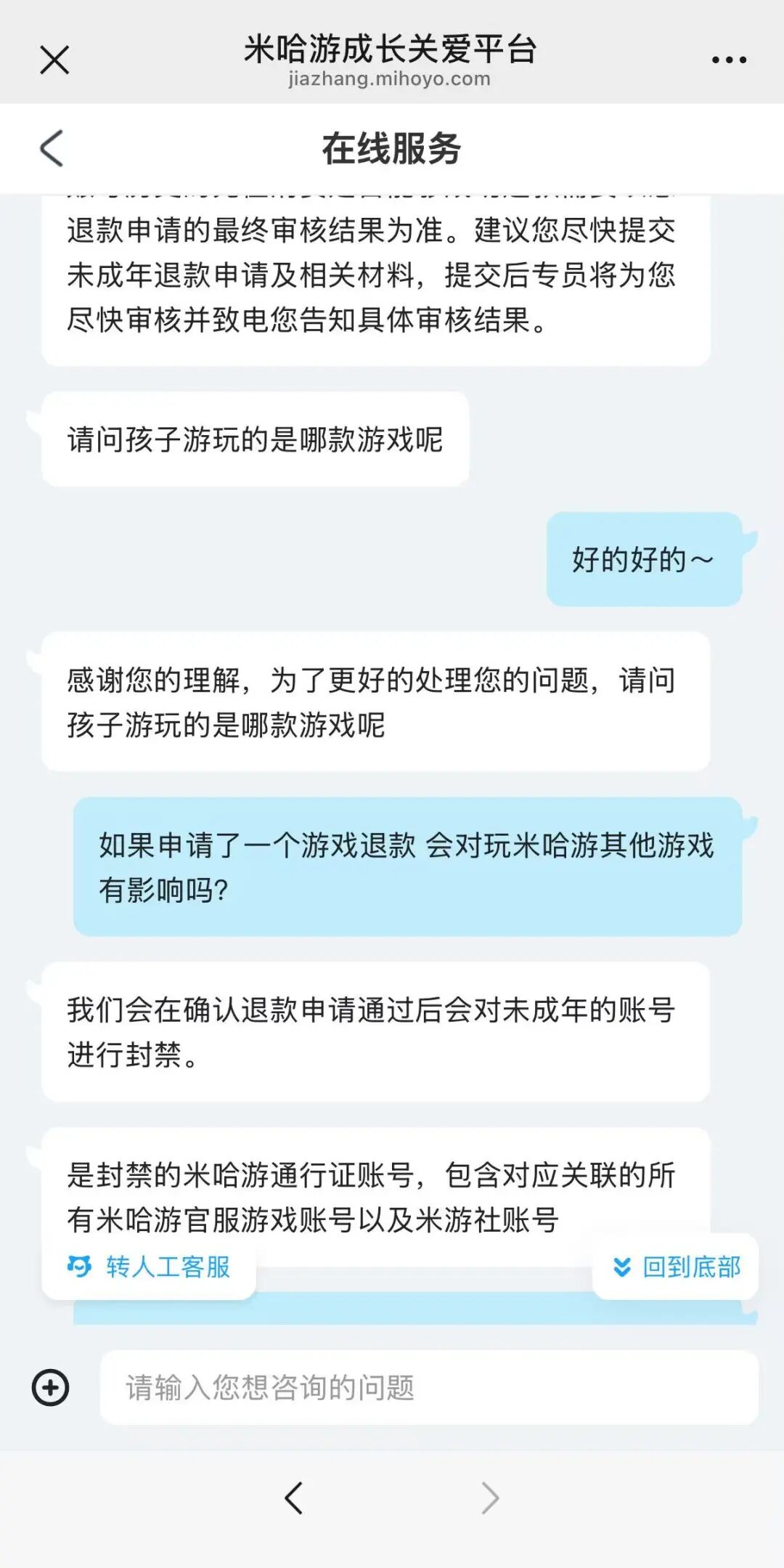米哈游客服同样提供了需要的证明材料清单,并表示退款金额以实际审核结果为准。而被问及申请未成年人充值退款是否会影响其他游戏,客服回复“申请通过后会对未成年的账号进行封禁”,且“封禁的是米哈游通行证账号”。