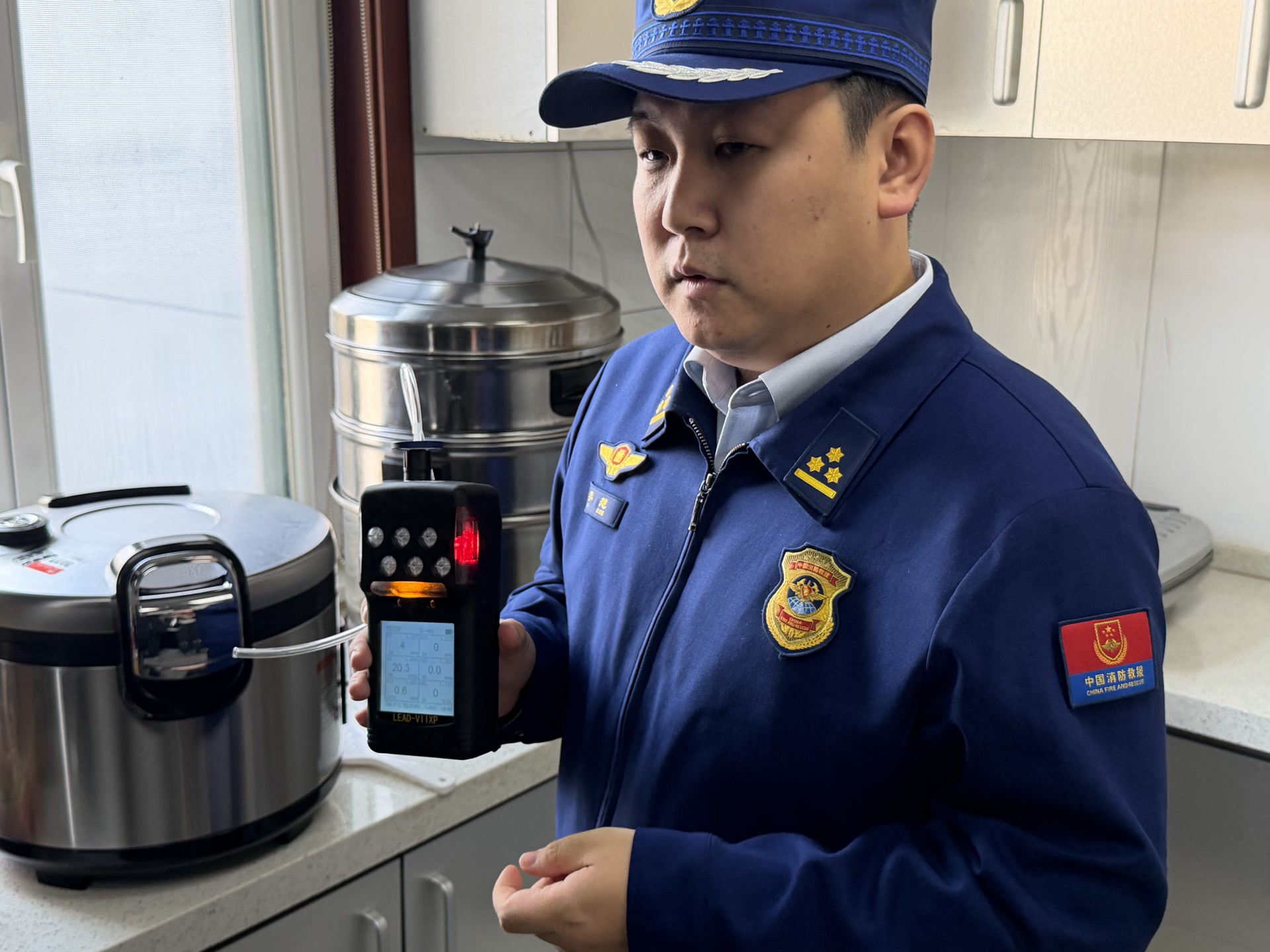 李想手握一台检测仪,走进门窗紧闭的厨房内,“它可以实时监测一氧化碳、氧气和硫化氢等6种气体的浓度,当浓度超过一定数值,仪器便会发出声光报警。”