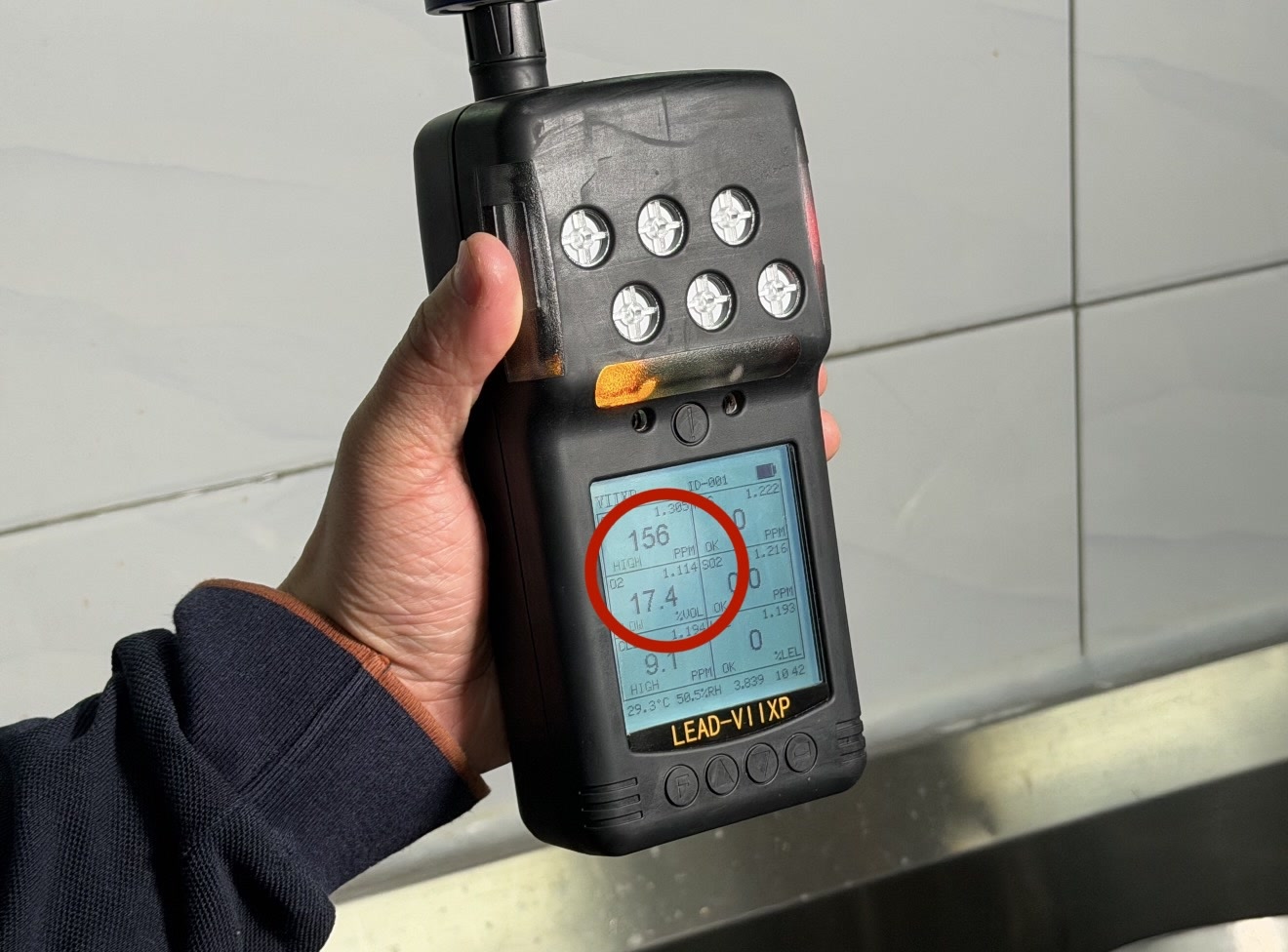 5分钟后,检测仪的数值开始出现变化。靠近燃气灶区域,氧气浓度逐渐下降,一氧化碳的浓度逐渐增高,15分钟后,检测仪不断闪烁灯光并发出警报声,其中,氧气浓度降至17.4%,低于警戒值19.5%,而一氧化碳浓度升至156ppm,远超过警戒值35ppm。