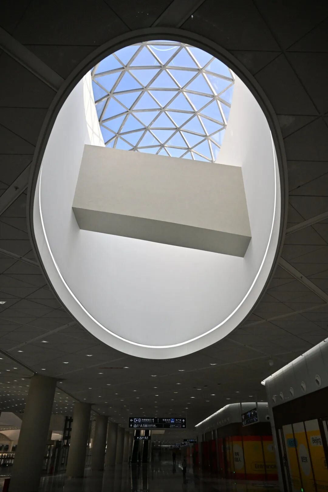 步入枢纽,空间高挑开阔,阳光通过“京帆”屋盖的采光孔洒下,丝毫感觉不到身处地下。京帆的三角透光孔与室内的三角照明,构成了形态与意境上的完美呼应。自然光与人工光通过几何形态整齐排列,塑造出枢纽内部标志性的现代美学画面。