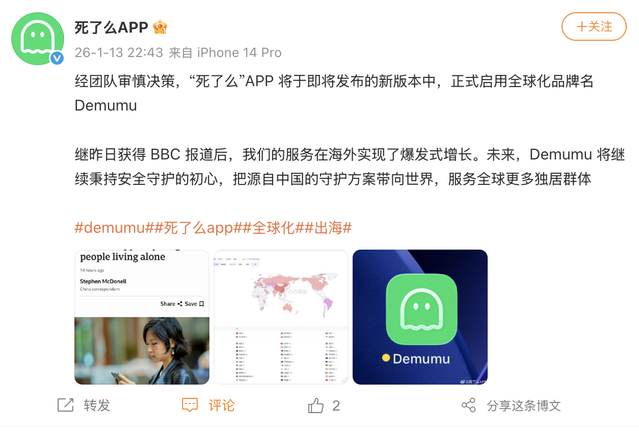 经团队审慎决策,“死了么”APP将于即将发布的新版本中,正式启用全球化品牌名Demumu。继昨日获得BBC报道后,我们的服务在海外实现了爆发式增长。未来,Demumu将继续秉持安全守护的初心,把源自中国的守护方案带向世界,服务全球更多独居群体。