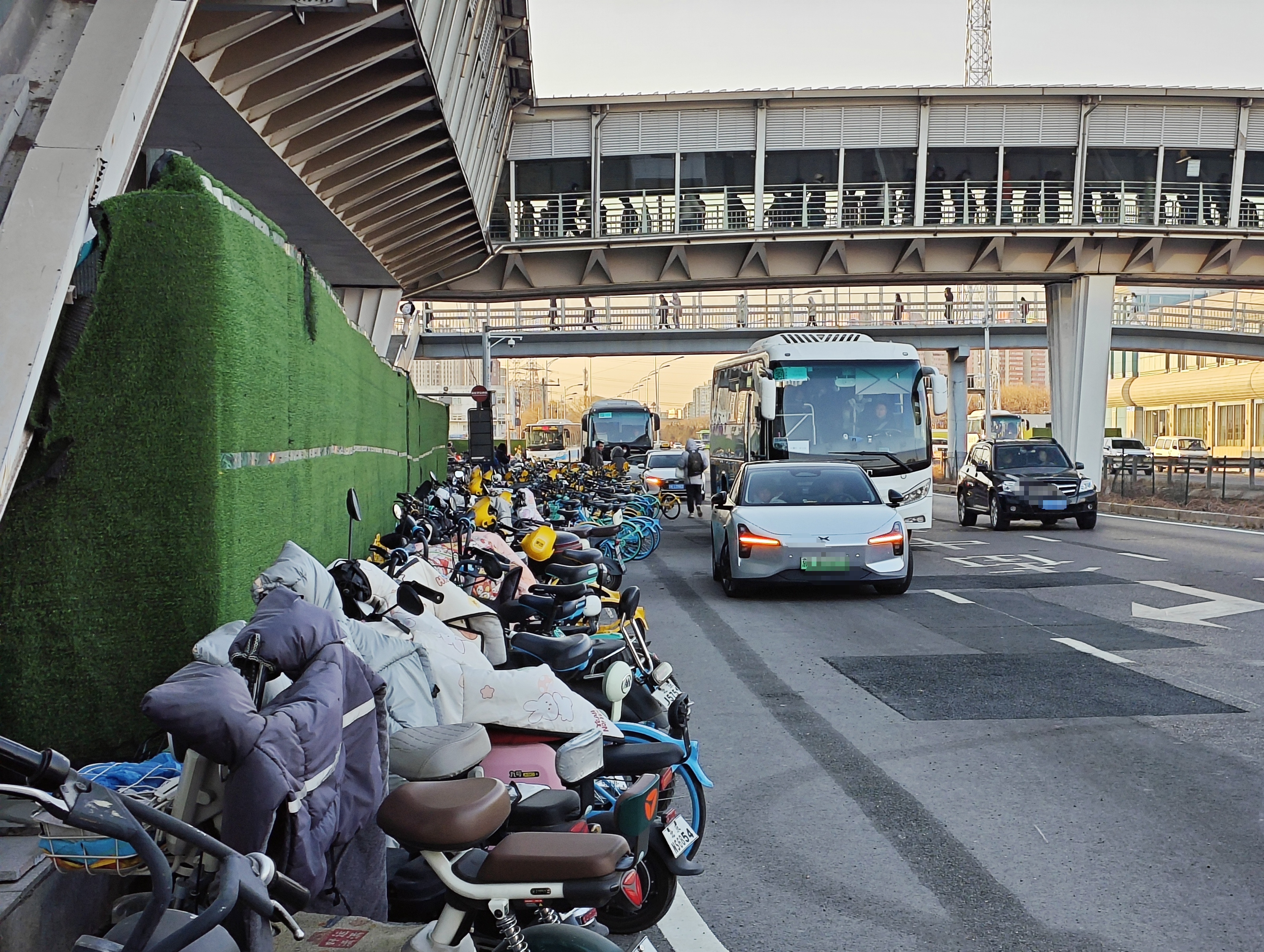 望京西交通枢纽迟迟未开放不仅导致17号线望京西站无法开通,也使邻近地铁站的京承高速辅路承载了较大的交通压力。当天早上7点多,望京西地铁站B口外人行便道及京承高速辅路非机动车道内停满了共享单车及电动自行车。不少从B口出站的乘客只能在机动车道内上下公交车,或者等候网约车和班车。每当有大巴车进站或临停,京承高速外侧车道都会形成堵点,导致通行不畅。