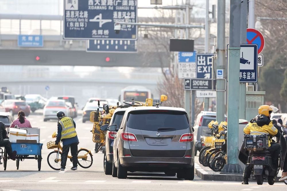 西大望路辅路,朝阳区建外街道政务服务中心前,停着多辆“无牌”非法运营车。
