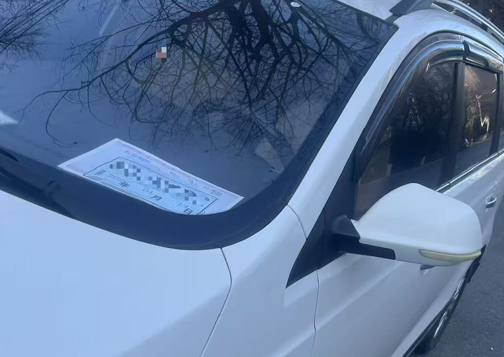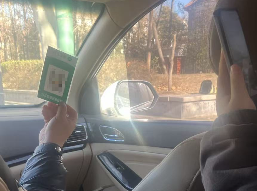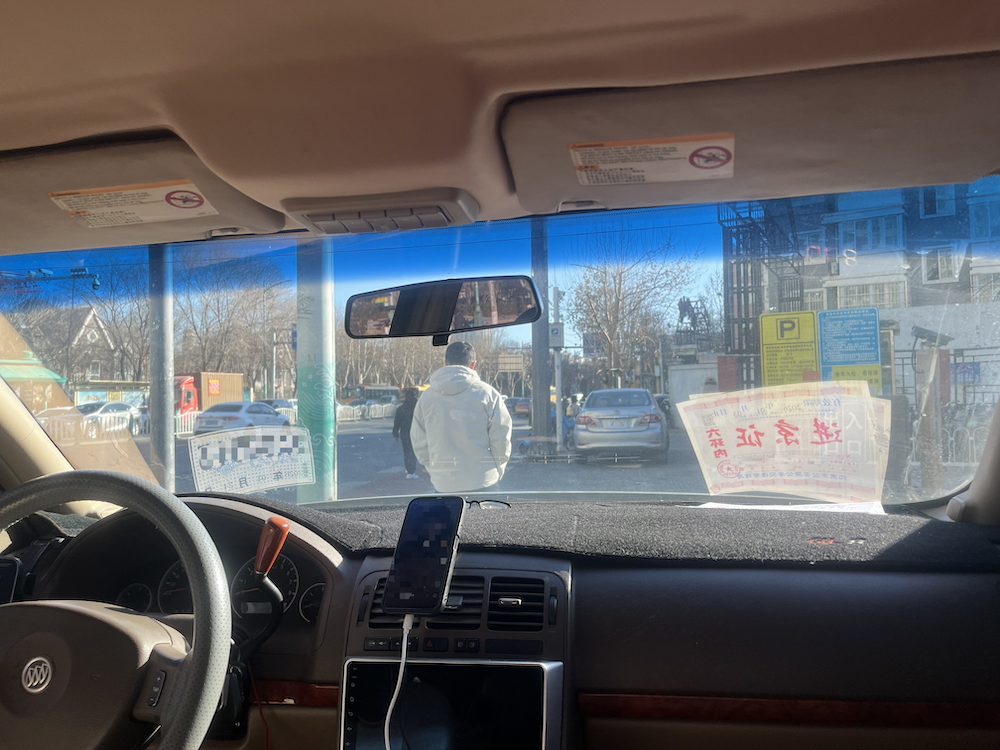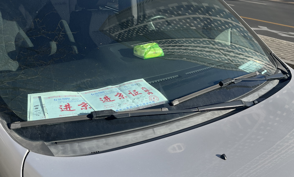 “无牌”非法运营车辆挡风玻璃上临时牌照和进京证的倒影。