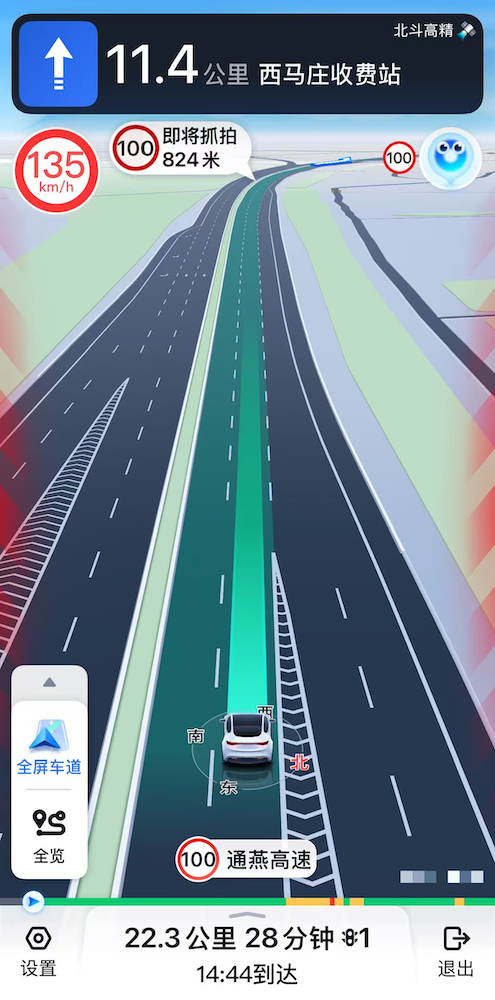 记者检测到所乘坐的“无牌”车时速达135公里。地图APP截图