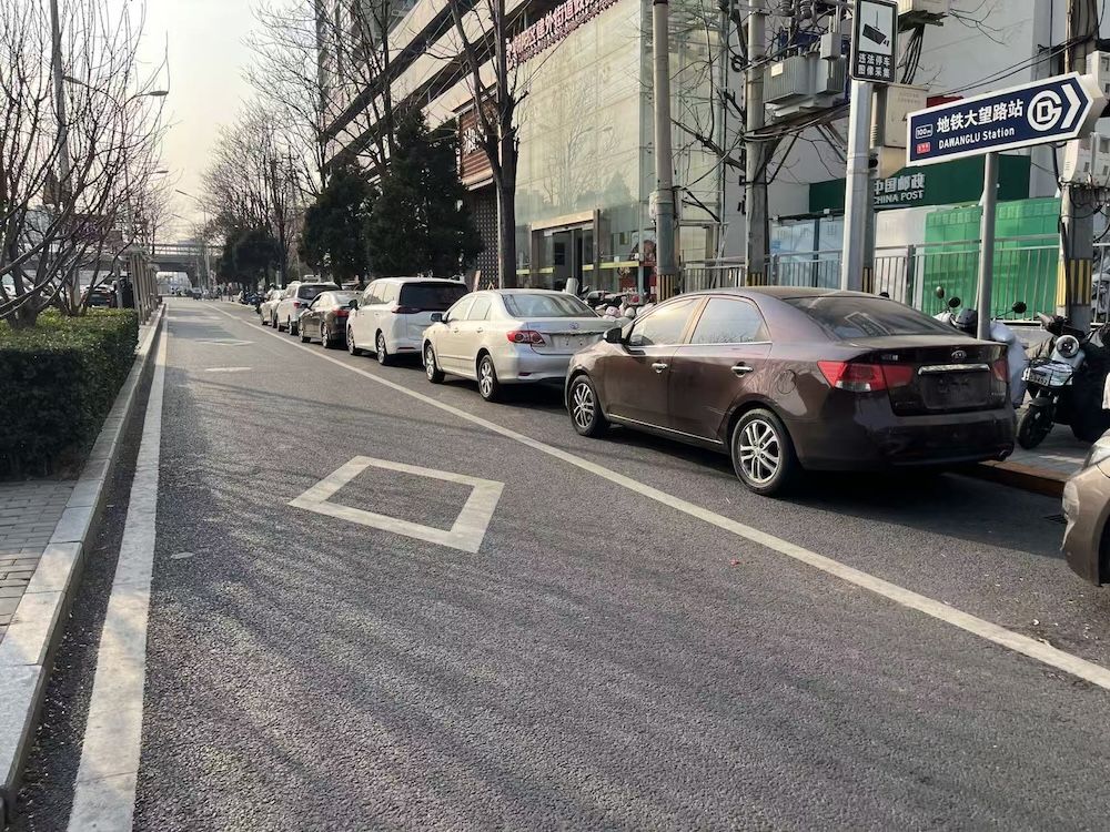 这些揽客司机的“无牌”车就停在一旁不远处的监控死角——“西大望路”路牌之下。一辆车拉满乘客出发后,下一辆“无牌”车就会补上来。