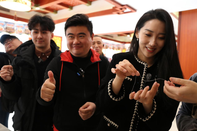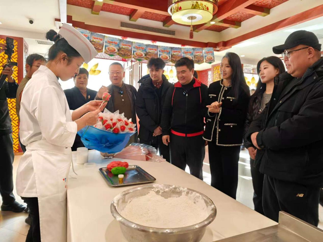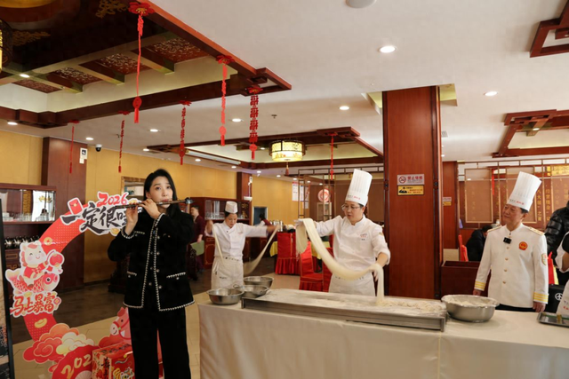 活动现场,孙楚泊手持竹笛,奏响为新年特别创作的《福到万家》。在她身边,同和居首席面点师张刚正“跟着节奏做拉面”,手中的面团随着音乐的节奏被轻轻抻、拉、抖、摔,一曲奏罢,面团经历抻、拉、抖、摔,已变为1.6万余根细如发丝的“龙须面”。孙楚泊还亲自尝试了龙须面穿针,一次成功。她不禁惊呼:“这哪里是做饭,分明是艺术品,老字号的非遗技艺果然名不虚传。”除了看表演,现场还有“能带走的浪漫”——同和居王敏、孙莹两位面点大师巧妙地将面团塑造成一朵朵栩栩如生的玫瑰,将其作为非遗特色礼品赠予现场嘉宾及观众。“本来只是来吃饭,没想到还看了场演出,收了朵花,这顿赚大了!”正在店里用餐的顾客孙女士直呼“这顿饭超值”。