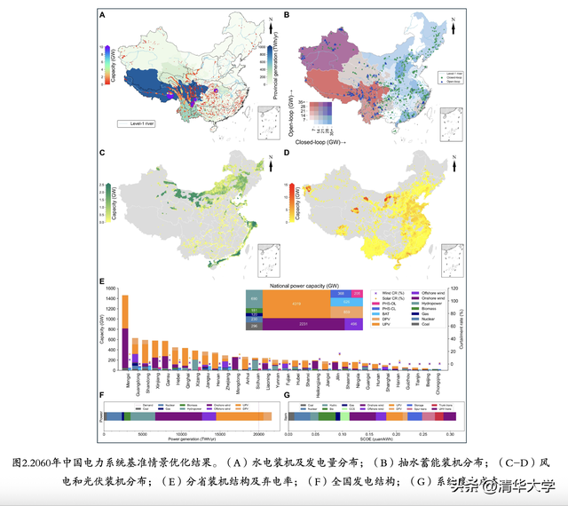 在基准情景下,为了满足2060年约20PWh的年电力需求并实现负排放目标,优化后的系统主要配置包括:水电690GW、风电2727GW、光伏5178GW、闭环抽水蓄能368GW、开环抽水蓄能205GW以及电池储能626GW;系统度电成本约为0.33元/kWh,弃风弃光率控制在较低水平。