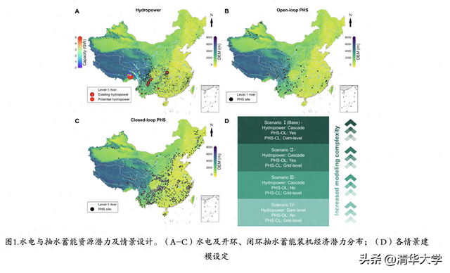 研究团队利用高分辨率地理信息系统数据,系统评估了我国水电和抽水蓄能的资源潜力。结果表明,我国现有及潜在水电装机容量经济潜力共计715GW,主要集中在西藏、四川、云南等西南地区;开环抽水蓄能经济潜力约390GW,闭环抽水蓄能经济潜力约1960GW。在数据基础上,研究设计了四种情景,从高精度的梯级优化与站点级规划逐步简化至传统的电网级建模方式,以量化不同建模精度设定对系统规划结果的影响。