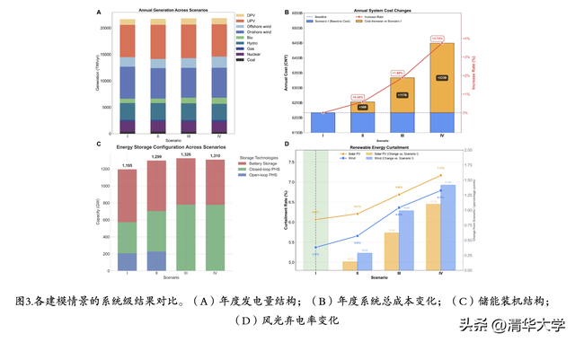 抽水蓄能和梯级水电调度的精确刻画,对系统经济性具有重要价值。部署205GW开环抽水蓄能每年可降低系统成本810亿元,并分别减少风电和光伏弃电11%和7.2%;全国范围内的梯级水电协同优化每年可节省约1160亿元。这种成本节约主要源于系统灵活性的提升:梯级调度允许在枯水期释放更多水能,从而支持更大规模的光伏接入,减少对昂贵灵活性电源的依赖。此外,建模精度对规划结果影响显著:传统的电网级固定时长建模方法高估了30%的闭环抽水蓄能容量需求,导致每年360亿元的额外成本。