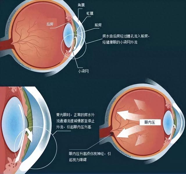 当寒冷刺激或身处暗环境(冬季常见)时,瞳孔会扩大。对房角狭窄者(常见于中老年、远视人群),瞳孔扩大后周边堆积的虹膜会堵塞房角,也就是眼内液体的排水口,从而导致眼压飙升(正常值10-21mmHg,发作时常>50mmHg),进而压迫视神经。