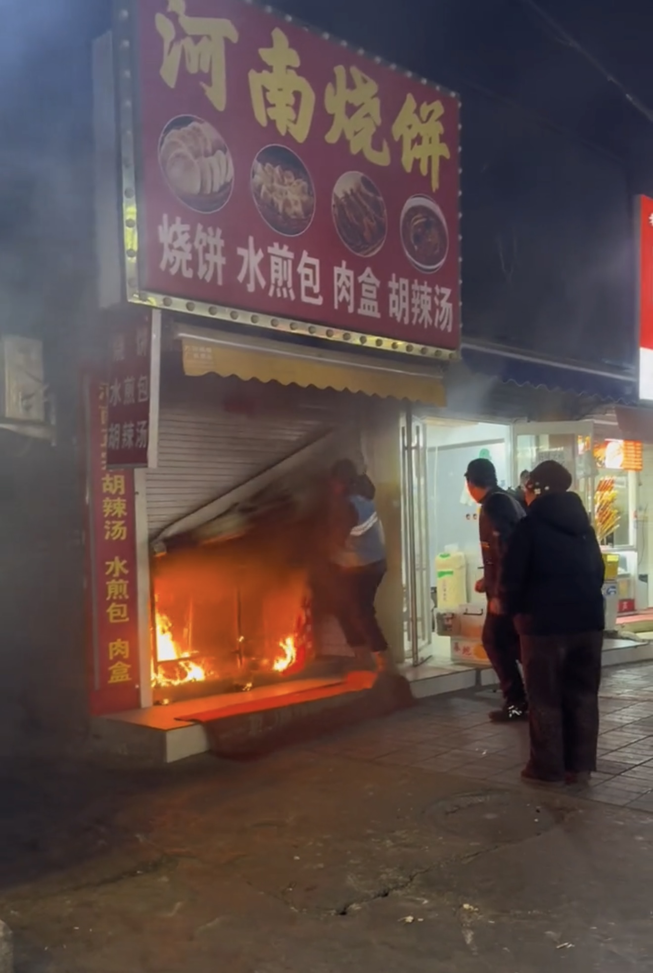 1月8日晚上9时许,刘金宝接妻子下班时,途经漷马路旧线的商业街时,突然听到前方传来“着火了”的呼救声。他看见一家关着门的主食店正往外冒浓烟,老旧的卷帘门距离地面有两三厘米缝隙,火苗正从缝里往外蹿。此时店主不在店内,卷帘门也被锁死。