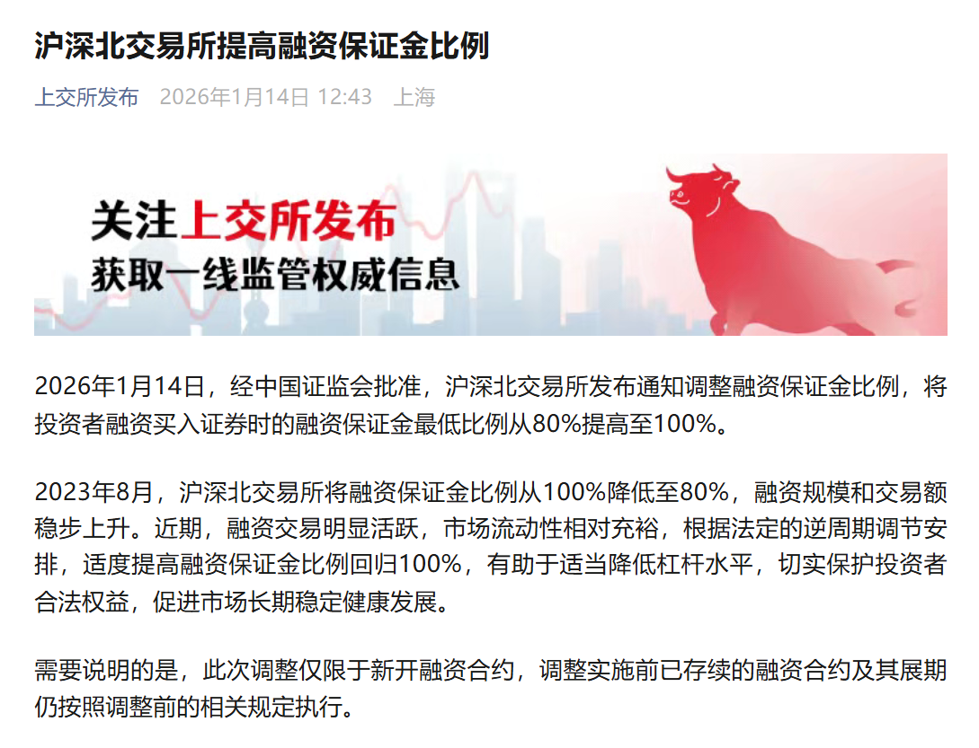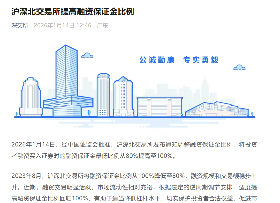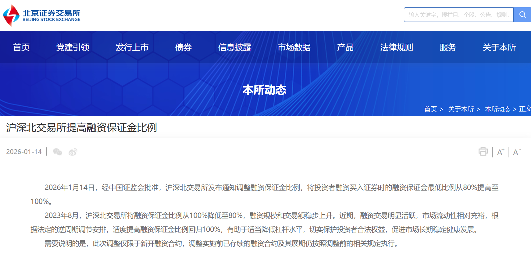 1月14日,经中国证监会批准,沪深北交易所发布通知调整融资保证金比例,将投资者融资买入证券时的融资保证金最低比例从80%提高至100%。