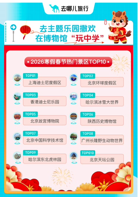从景区门票预订来看,主题乐园和博物馆最受欢迎,上海迪士尼度假区、北京环球度假区、香港迪士尼乐园领跑,哈尔滨冰雪大世界门票预订同比增长9倍,开封万岁山武侠城门票预订同比增长6倍。北京故宫博物院、陕西历史博物馆、中国科学技术馆等文化类场馆,则成为“玩中学”的热门选择。