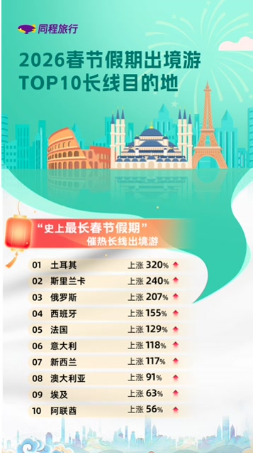 凭借更简化的出行手续、更低的出行门槛,以土耳其为代表的新晋免签国在春节假期迎来显著增长,平台上土耳其酒店预订同比猛涨2.3倍。此外,同程旅行数据显示,春节假期出境游前十名长线目的地中,土耳其以320%的热度同比涨幅居于首位,与此同时,10天7晚土耳其经典大环线跟团游产品在春节出境度假产品销量中也排进前列。据了解,土耳其“骏马之乡”卡帕多奇亚将设立“马年主题村”,策划马术表演等一系列专属项目与体验活动来接待中国游客。