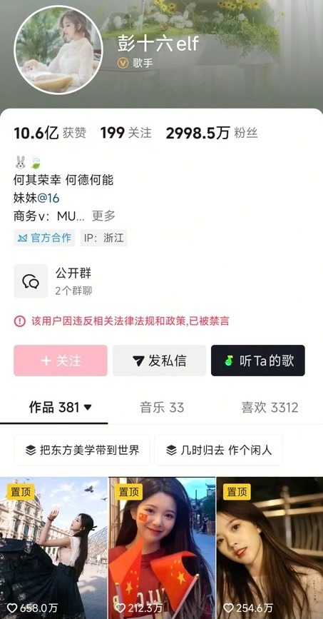 公开资料显示,彭煊之网名为“彭十六”,在抖音平台发布自拍的古风视频后,逐渐成为抖音视频达人。截至发稿,“彭十六elf”抖音账号主页显示“该用户因违反相关法律法规和政策,已被禁言”。此外,其微博、小红书账号均已被禁言。