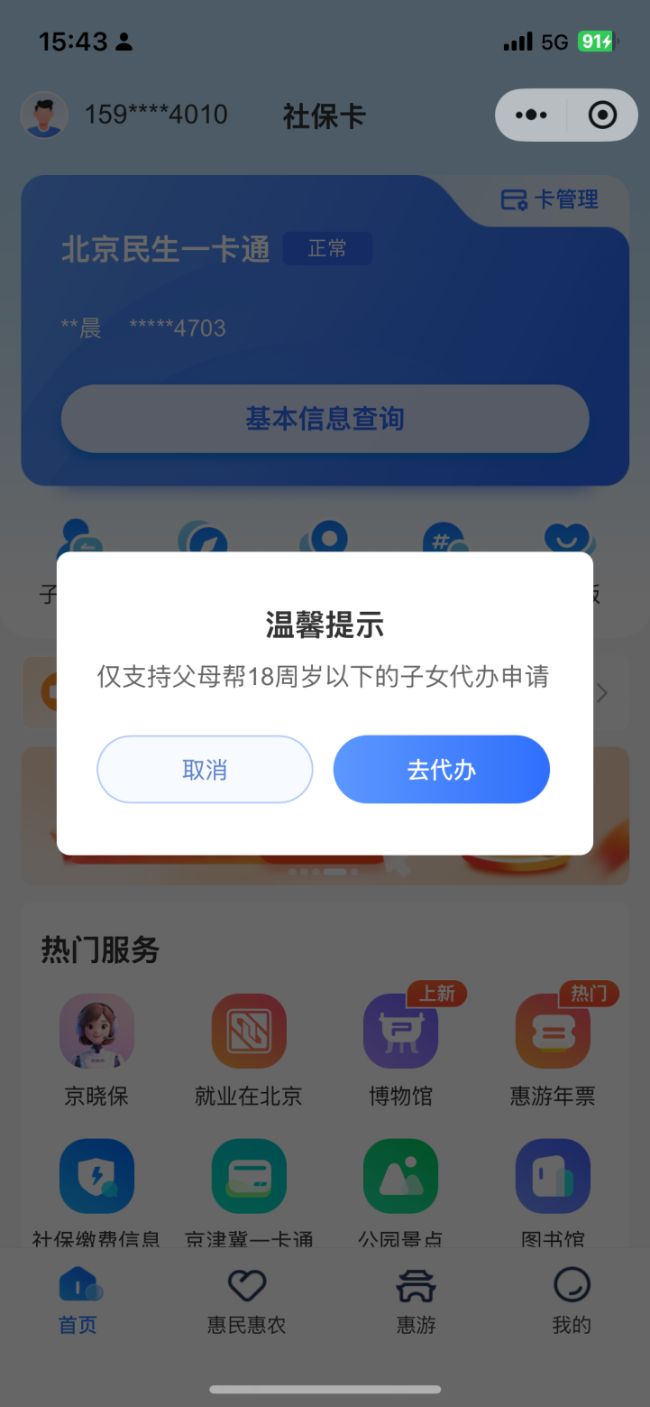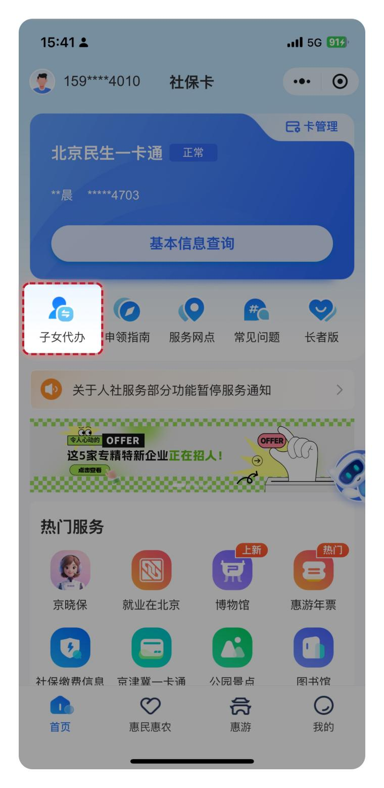 1.进入北京民生一卡通小程序后,展示首页社保卡页,点击代办卡片区域,进入代办申请流程页面。