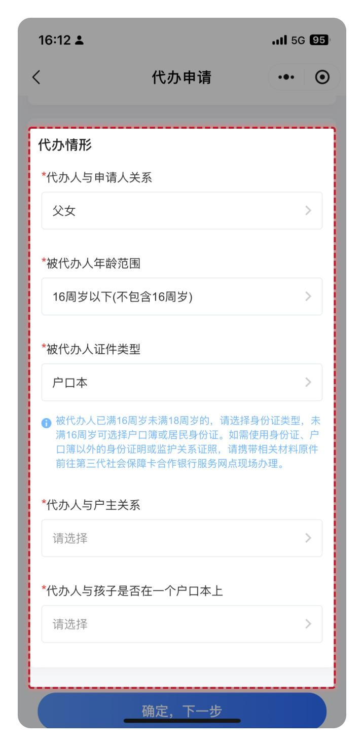 在“代办情形”下,选择“代办人与申请人关系”“被代办人年龄范围”“被代办人证件类型”。若被代办人证件类型选择为“户口本”,需要选择“代办人与户主关系”“代办人和孩子是否在一个户口本上”。