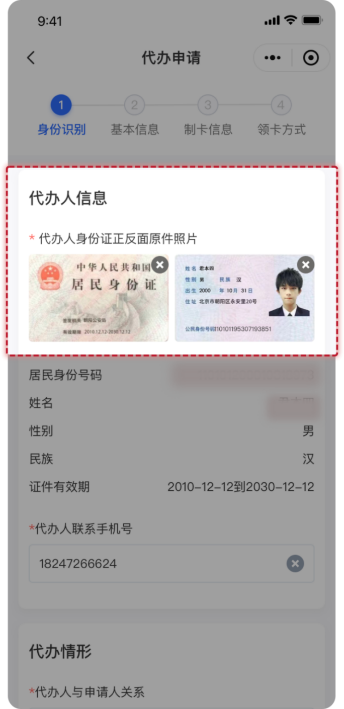 在“代办人信息”下,需要上传代办人的身份证正、反面原件照片等相关信息进行身份确认,并输入代办人联系手机号。