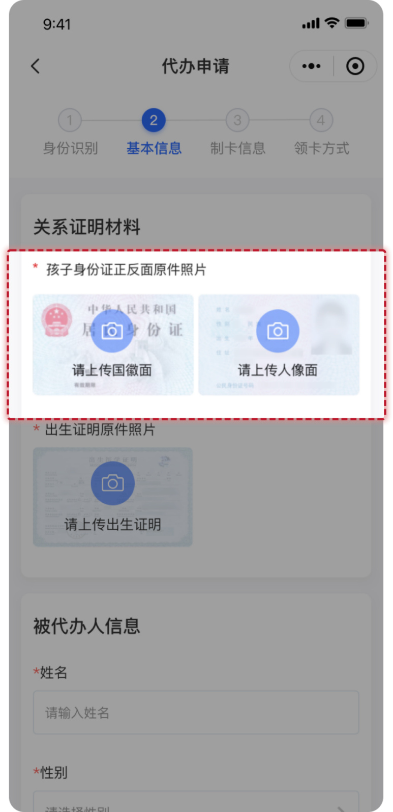 若选择被代办人的“证件类型”为“居民身份证”,则需要上传被代办人的身份证正、反面原件照片和出生证明原件照片。