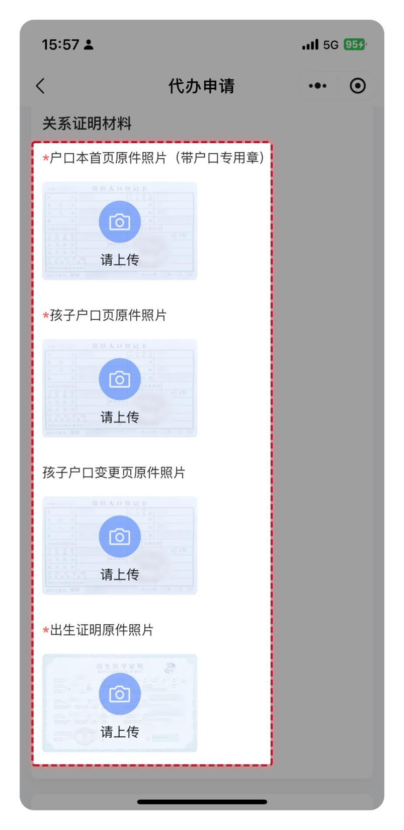 若选择被代办人的“证件类型”为“户口本”,则根据“代办人和户主关系”“代办人和孩子是否在一个户口本上”的选择关系上传相应的材料。