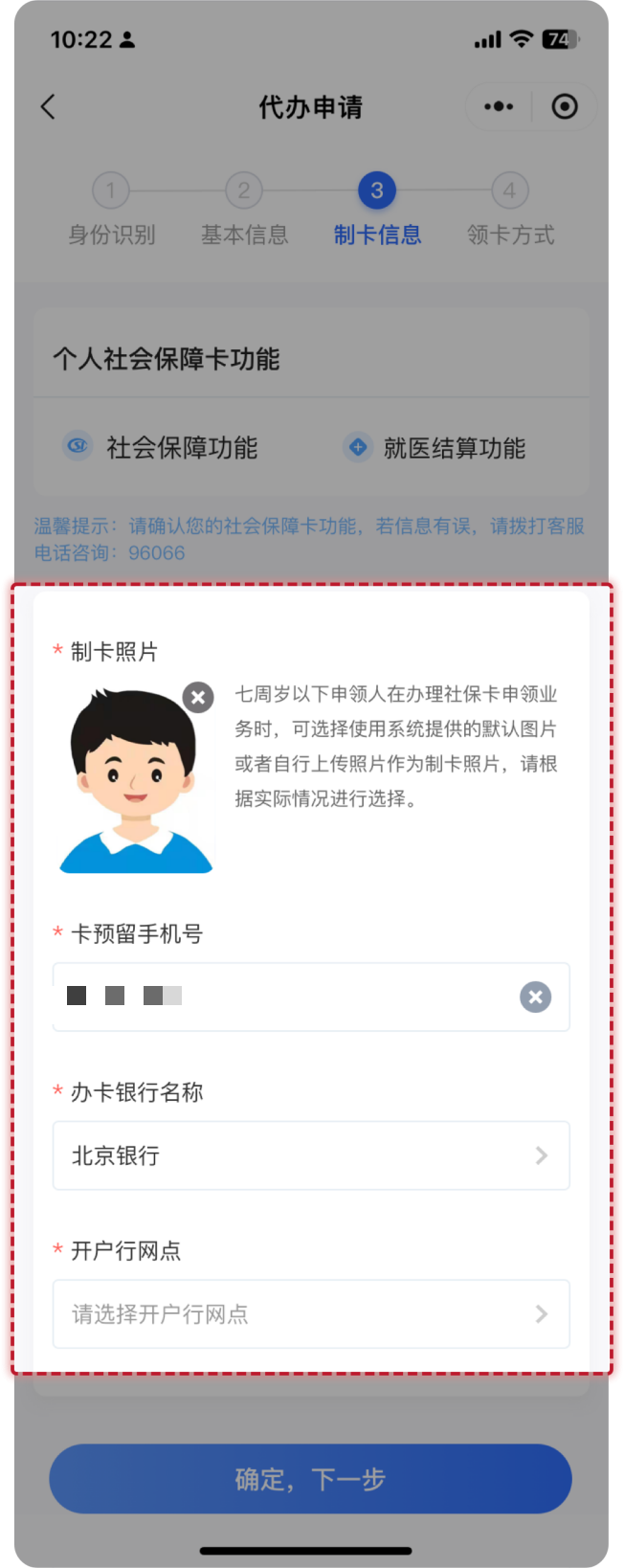 需要上传被代办人本人制卡照片(子女小于7岁可以使用系统提供的默认卡通照片作为制卡照片)、卡预留手机号、选择办卡银行、选择开户行网点等。