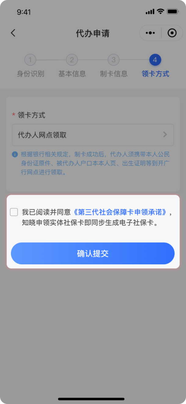 3.阅读免责声明后,填写申请信息,依次是代办人(父母)的身份识别、被代办人(子女)的基本信息、被代办人(子女)的制卡信息和确认领卡方式。