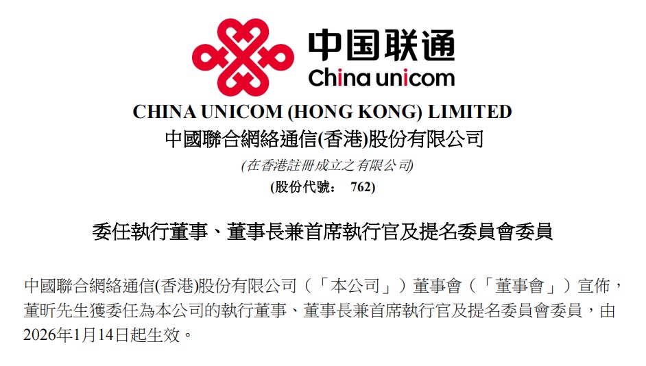 中国联通1月14日在港交所公告,中国联合网络通信(香港)股份有限公司董事会宣布,董昕获委任为本公司的执行董事、董事长兼首席执行官及提名委员会委员,由2026年1月14日起生效。