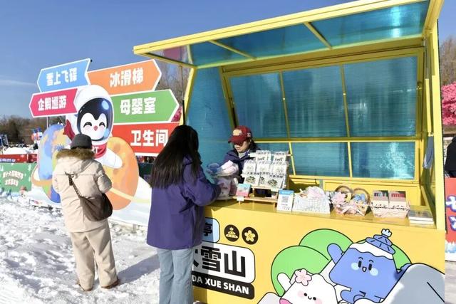 除了园内陶花园文创店和冰雪嘉年华南门旁的文创专柜,雪场内大象滑梯北面还增设了公园自研文创产品展售点。不少游客体验完滑梯后,都特意前来选购冰箱贴。