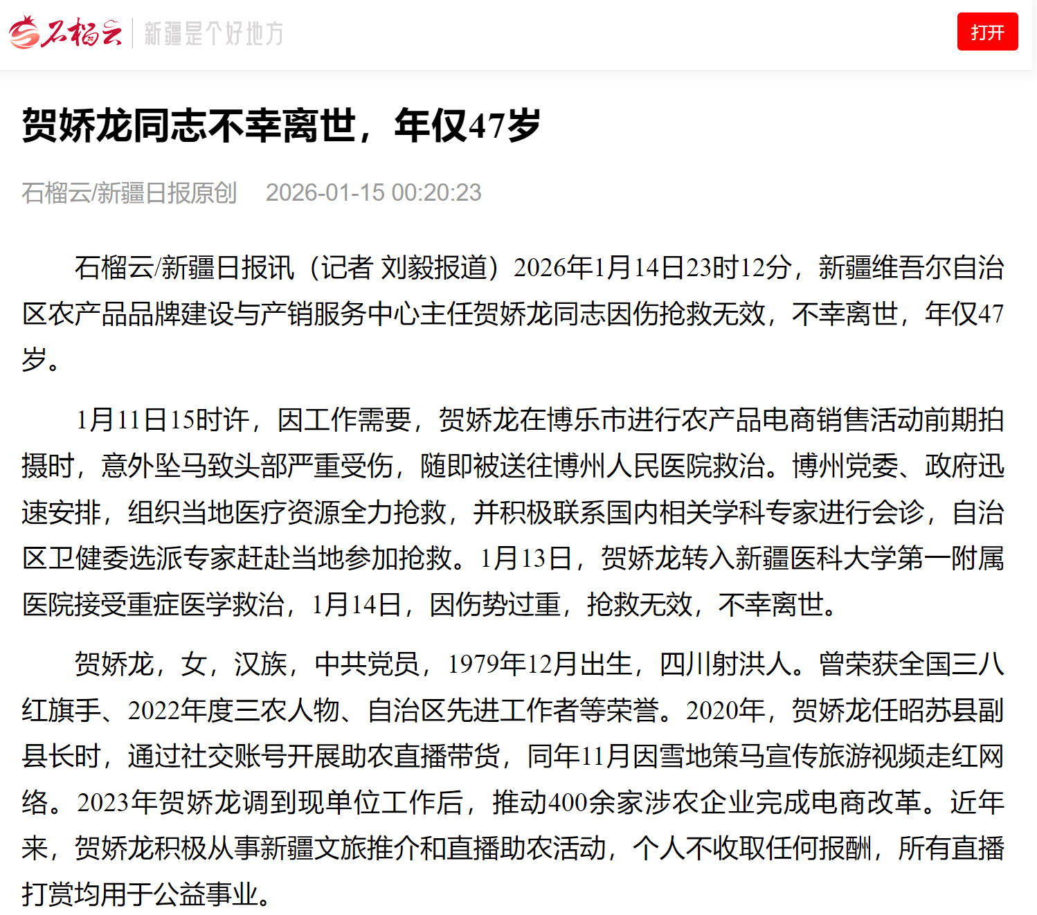 2026年1月14日23时12分,新疆维吾尔自治区农产品品牌建设与产销服务中心主任贺娇龙同志因伤抢救无效,不幸离世,年仅47岁。