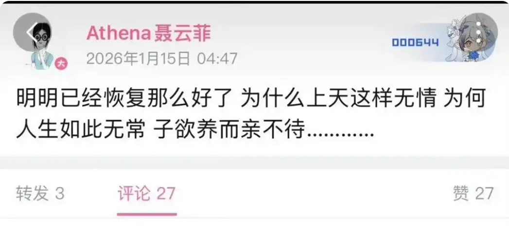 聂云菲在15日凌晨4时47分发文写道:明明已经恢复那么好了,为什么上天这样无情,为何人生如此无常,子欲养而亲不待……2013年,聂卫平曾患有直肠癌,治疗后情形良好。