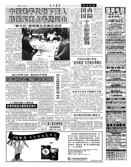 1988年,晚报杯全国业余围棋赛首次举办,当时参赛的有24个队,来自全国各地的晚报,比赛在中日围棋会馆举行。那届比赛,除了给业余棋手搭建舞台外,还特地组织了前10名业余棋手和10名专业棋手打对抗赛,聂卫平就参赛了。最终,在专业棋手让2子的情况下,业余棋手和专业棋手战成5比5平,这是中国棋坛第一次打通业余棋手和专业棋手交流的通道。