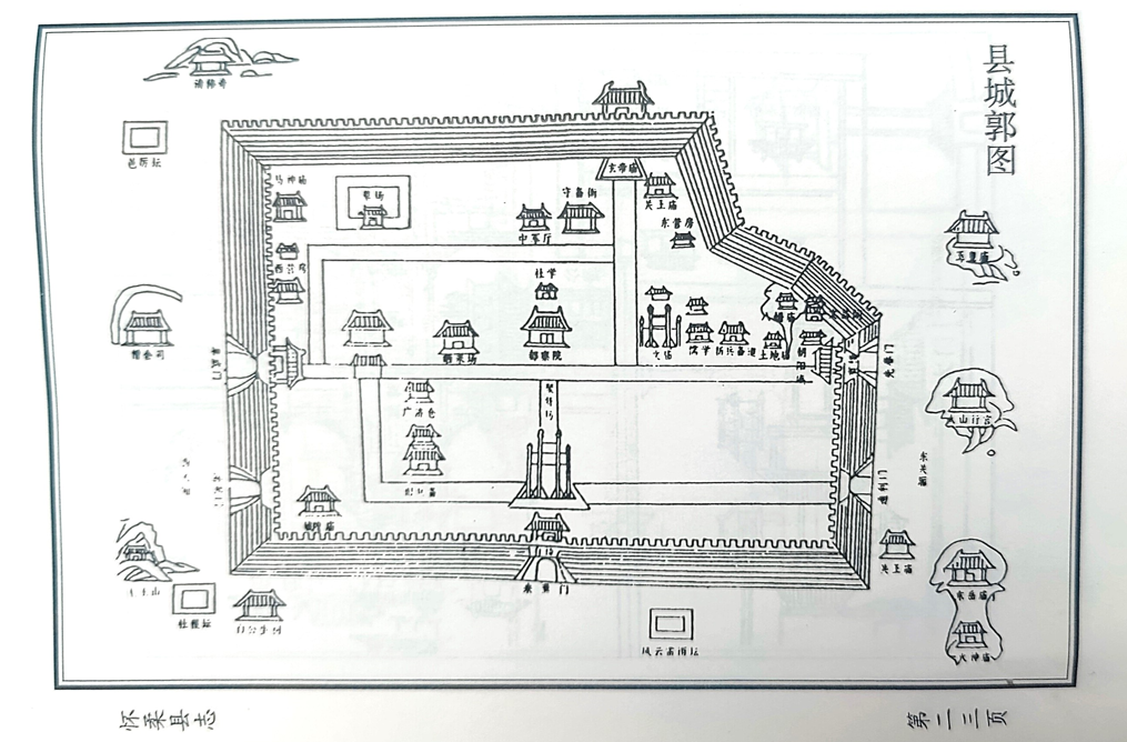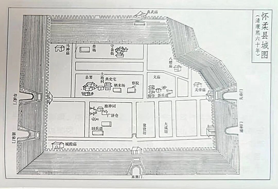 从明清怀柔县志县城图看,可能是由于绘图比例存在偏差,怀柔古城东西长、南北短,但实际上怀柔古城是南北长、东西短。另外,怀柔古城不是一个标准的长方形,而是一个五边形,相当于一个标准的长方形在东北角切去一块。现在的怀柔城区北高南低,古时候更是如此,古城就是依据地势地形修建的,因此呈现出不方正的特点。我区文化老人李祥写过一本《图说怀柔古城》书籍,里面详细介绍怀柔古城风貌和百姓生活场景,书中怀柔古城图更是全面展现了古城往昔风貌。