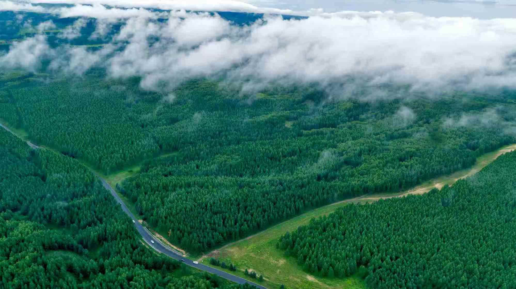 在承德市围场县,林间道路笔直通畅,森林和农田、河流、村庄,相依相伴,构成美丽和谐的林间美景,吸引众多京津冀游客到此一游。
