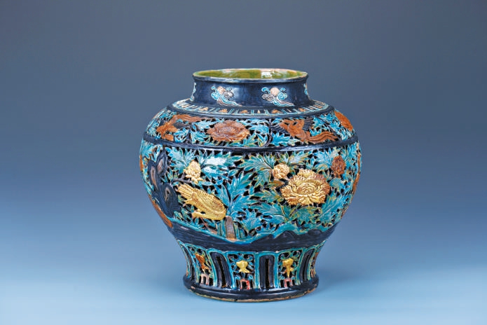 在工艺与审美上,珐华器釉色鲜艳,有“蓝如宝石、紫若水晶、黄似金珀”之称,釉质具玻璃质感,以蓝色为主要框架,辅以黄、绿、紫、白、黑等色,呈现五彩斑斓的视觉效果;装饰手法丰富多样,涵盖贴花、堆塑、镂空、刻划等,其中以堆塑最为普遍,能让器物表面呈现鲜明立体的效果;装饰图案则以人物、花鸟等民间常见题材为主,风格豪放洒脱,尽显时代特色。而以“线”起型的沥粉技法、“刀”刻型的镂雕技法、“贴”造型的堆塑技法为核心的装饰体系,也是学界界定珐华彩陶瓷的显著标志。