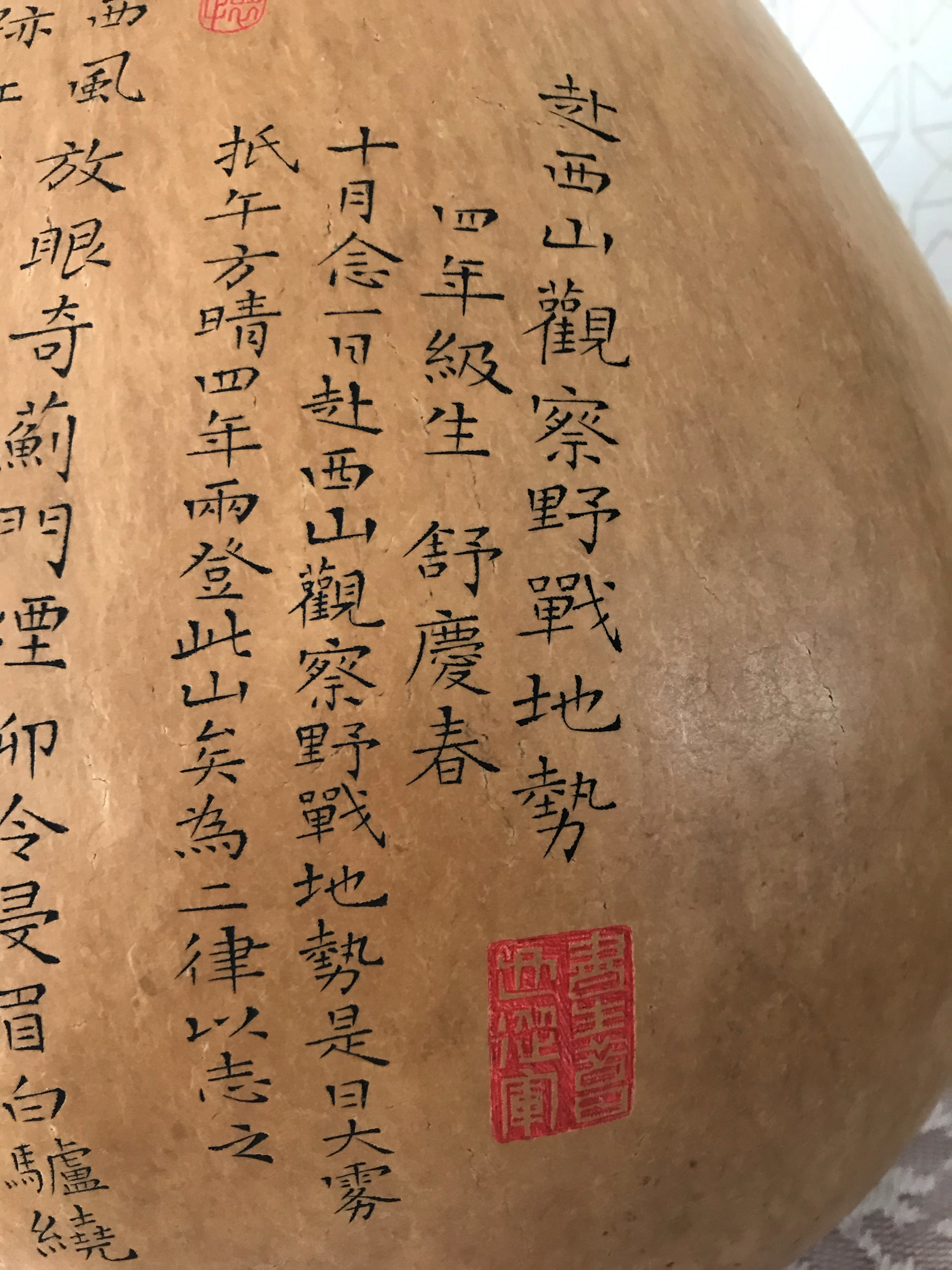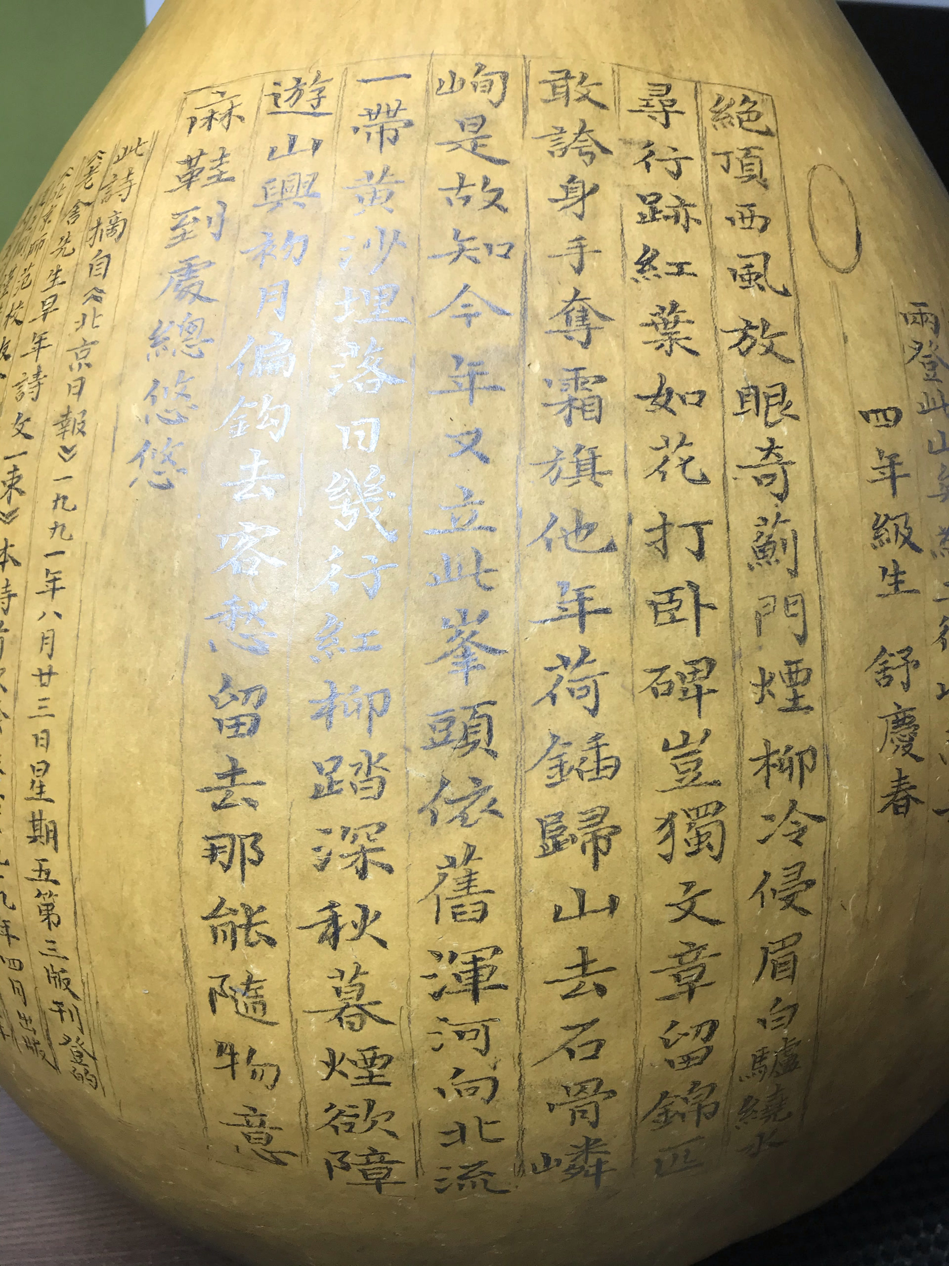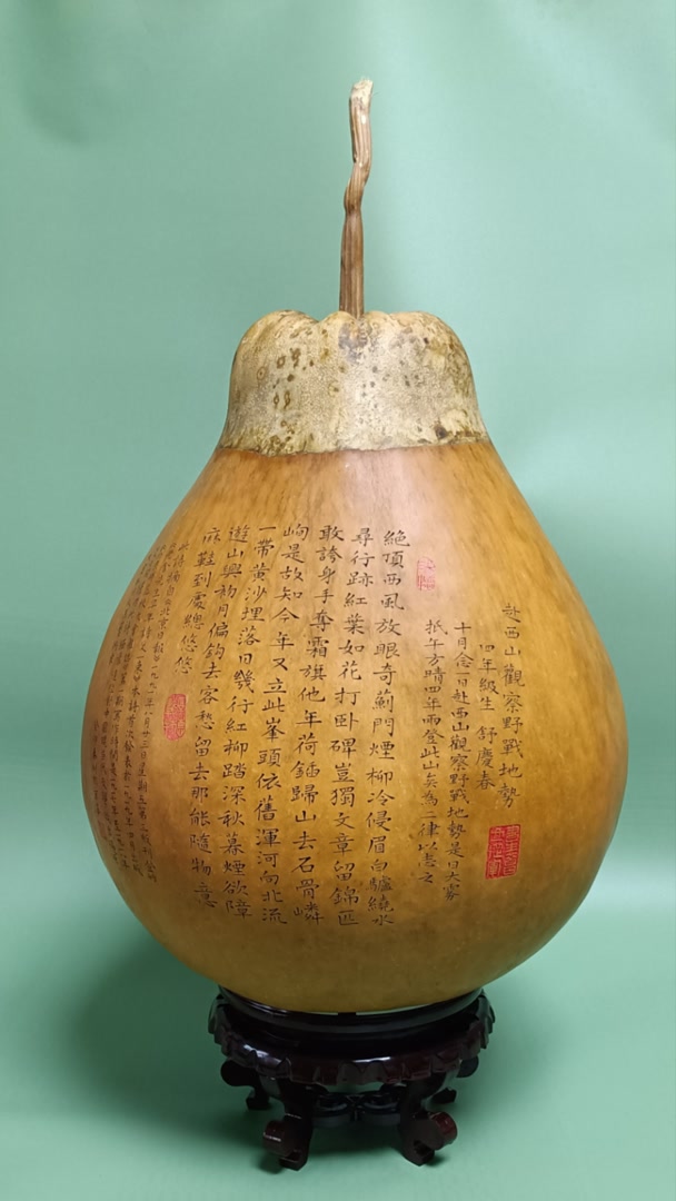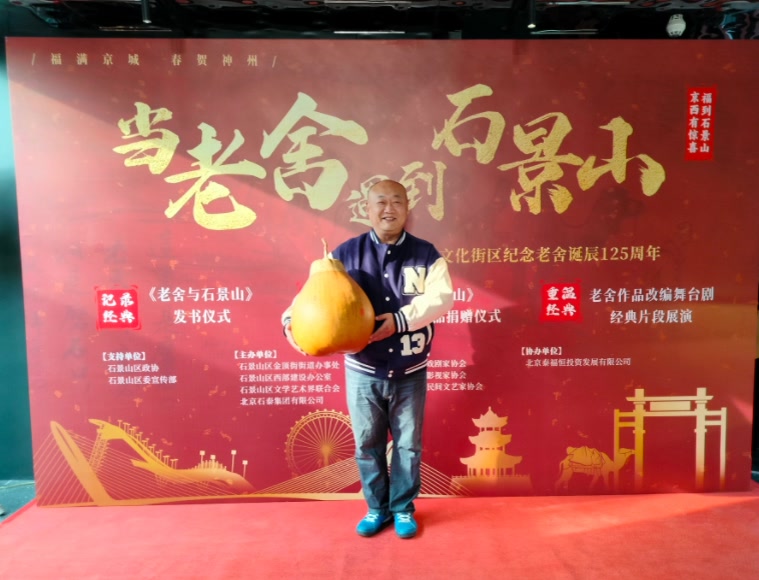 2024年,石景山区政协结集《老舍与石景山》一书,我在组稿的时候,很想将老舍先生青年时代在石景山区野营拉练时写的一首诗用葫芦的材质表达出来,找到王伟,他非常爽快的应下,并在第二天用铅笔草拟出诗稿的布局与我协商。最终完美地将老舍先生的诗文雕刻出来,收录到《老舍与石景山》一书。在老舍先生诞辰125周年的纪念活动中,将该作品捐赠给了石景山区非物质文化遗产中心的非遗展馆。