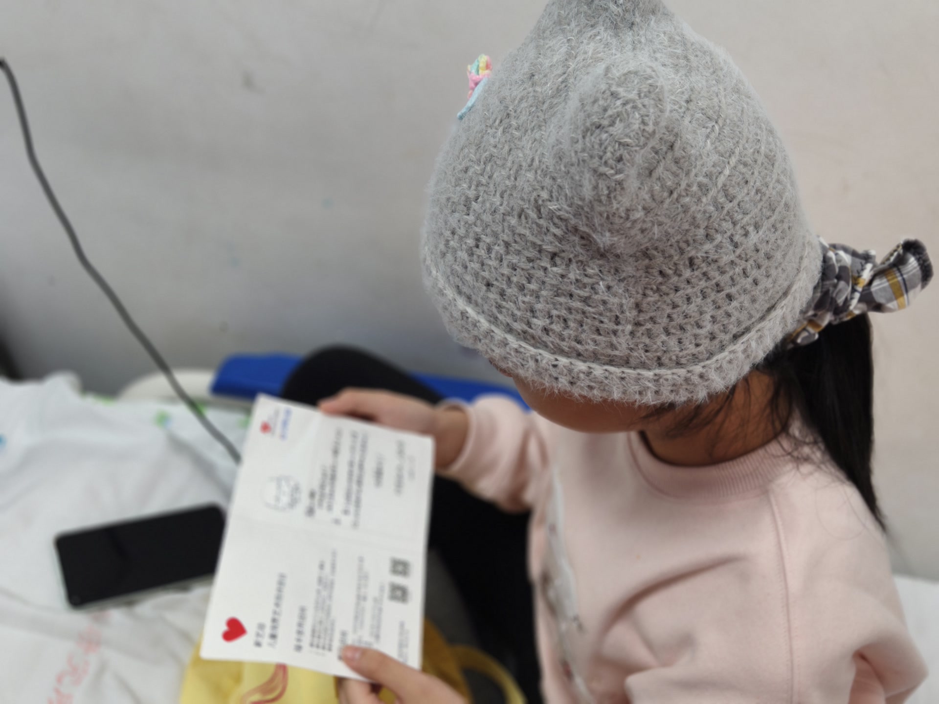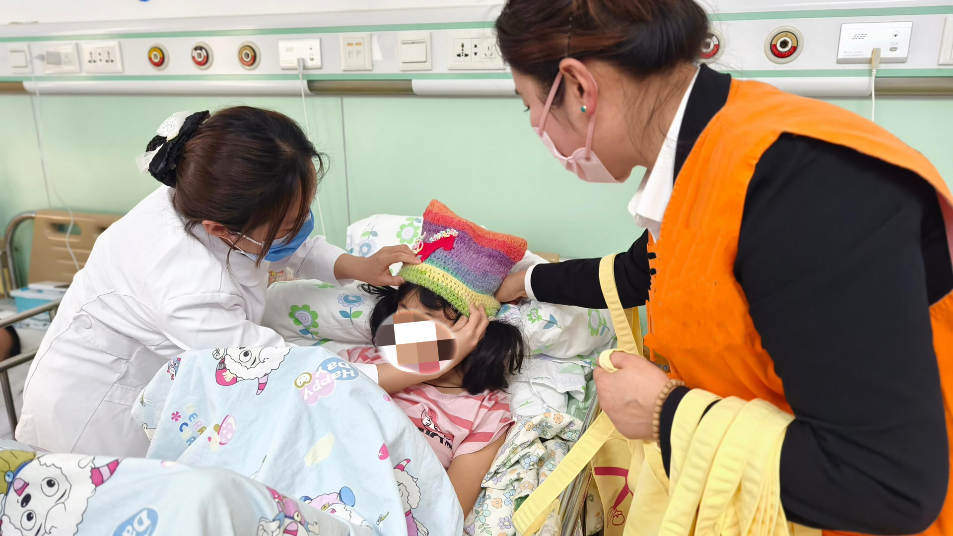 当天下午,12名贝壳公益的志愿者,拎着一个个装着彩色毛线帽和手写祝福卡的黄袋子,轻声走进首儿所的病房,挨个分发给病床上的孩子们。“帽子是彩色的,还有一只可爱的小马!我太喜欢了!”小慧(化名)刚结束上午的治疗,手上还绑着滞留针,她接过帽子后立刻戴在头上,冲着志愿者的镜头比了一个胜利的手势。隔壁病房里,3岁的小雨(化名)害羞地依偎在妈妈怀里,收到粉色小花帽后,听着妈妈念出“早日康复,快乐成长”的祝福语,瞬间露出了灿烂的笑容。