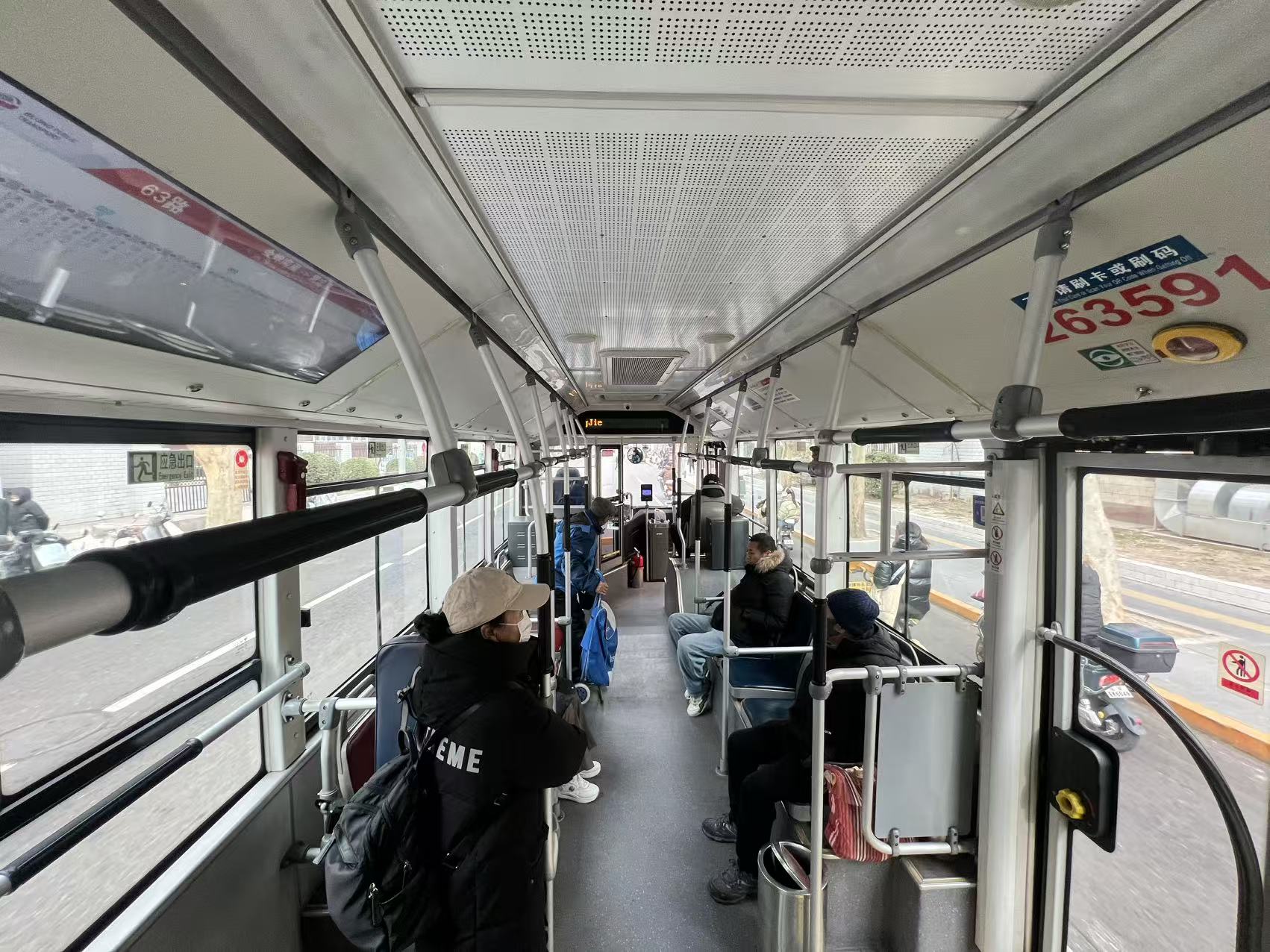近日,记者相继乘坐了52路和63路公交车,发现车厢里确实不再张贴乘车路线图,取而代之的是电子显示屏。电子屏上会滚动显示乘车路线图、阶梯票价收费标准、车内禁止吸烟等提示语、老弱病残孕专座标识等内容,而乘车线路图只有在车辆即将到站以及从站内驶出时才会出现,且持续时间较短。