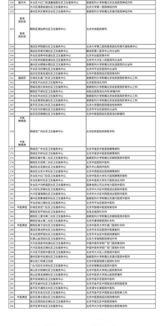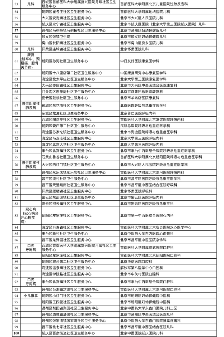 本次经评审,东城区和平里社区卫生服务中心等159家社区卫生服务机构的206个专病特色科室达到建设标准,确定为新一批社区卫生服务机构专病特色科室;84家三级或专科医疗机构的172个临床专业科室确定为社区卫生服务机构专病特色科室培育基地。